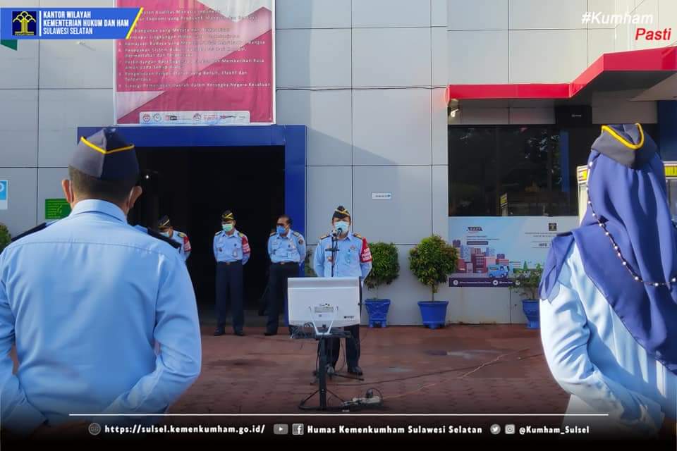 Makassar – Jajaran Pegawai Kantor Wilayah Kementerian Hukum dan HAM Sulawesi Selatan dipimpin oleh Kepala Kantor Wilayah Harun Sulianto Mlaksanakan apel pagi perdana Tahun 2021, Senin(04/01/2021).