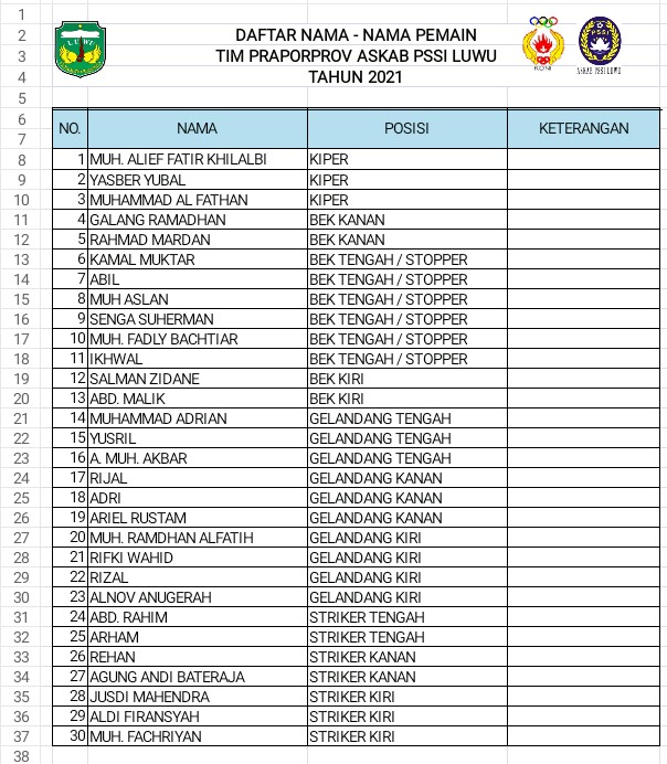Daftar 30 pemain yang lolos untuk mewakili Kabupaten Luwu di ajang Pra Porprov.