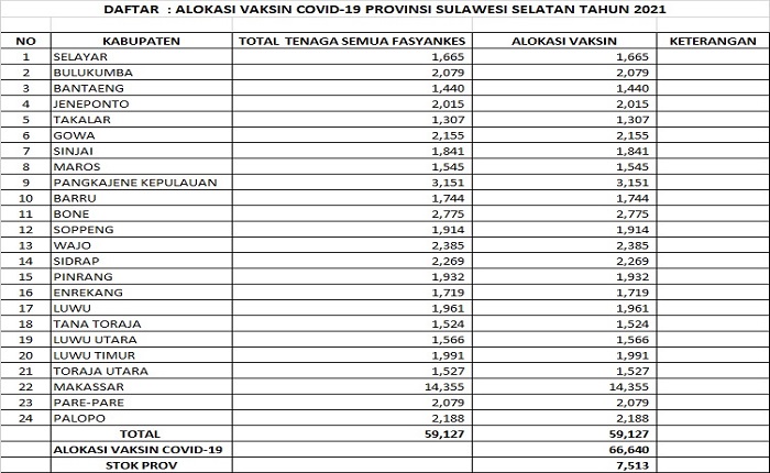 Berdasarkan data dari Dinas Kesehatan Provinsi Sulsel, jumlah vaksin yang akan diterima oleh masing kabupaten yaitu Kabupaten Selayar akan menerima alokasi vaksin sebanyak 1.665, Kabupaten Bulukumba sebanyak 2.079, Kabupaten Bantaeng 1.440, Kabupaten Jeneponto 2.015, Kabupaten Takalar 1.307, Kabupaten Gowa 2.155, Kabupaten Sinjai 1.841.