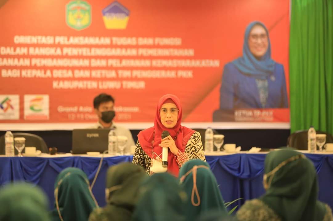 JURNALSULSEL.COM, LUWU TIMUR—Ketua Tim Penggerak PKK Kabupaten Luwu Timur, Hj, Sufriyati Budiman memberikan spirit dan motivasi saat didaulat memberikan ceramah Umum bagi seluruh Ketua Tim Penggerak PKK Desa se-Kabupaten dalam pelaksanaan Bimtek Orientasi Pelaksanaan Tugas dan Fungsi Dalam Rangka Penyelenggaraan Pemerintahan, Pelaksanaan Pembangunan dan Pelayanan Kemasyarakatan yang berlangsung di Grand Asia Hotel, Makassar, Senin (13/11/21).