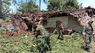 LUWU – Pasca bencana angin puting beliung yang merusak puluhan rumah warga di Kecamatan Lamasi Timur, Kabupaten Luwu, Sulawesi Selatan, Senin sore kemarin puluhan personil TNI bersama relawan turun membantu warga.