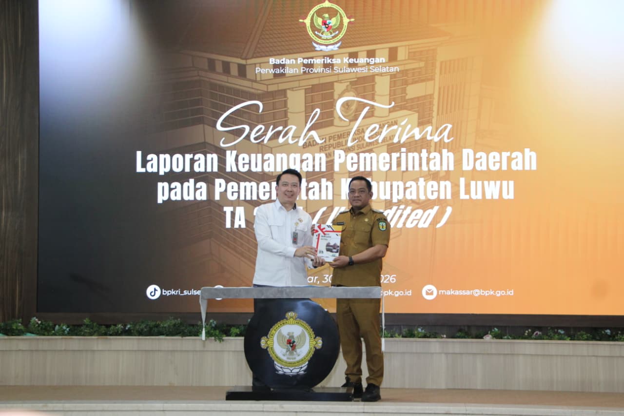 MAKASSAR — Pemerintah Kabupaten Luwu menyerahkan Laporan Keuangan Pemerintah Daerah (LKPD) Unaudited Tahun Anggaran 2025 kepada Badan Pemeriksa Keuangan (BPK) RI Perwakilan Provinsi Sulawesi Selatan. Penyerahan dilakukan oleh Bupati Luwu, Patahudding, kepada Kepala BPK Perwakilan Sulsel, Winner Franky Halomoan Manalu.