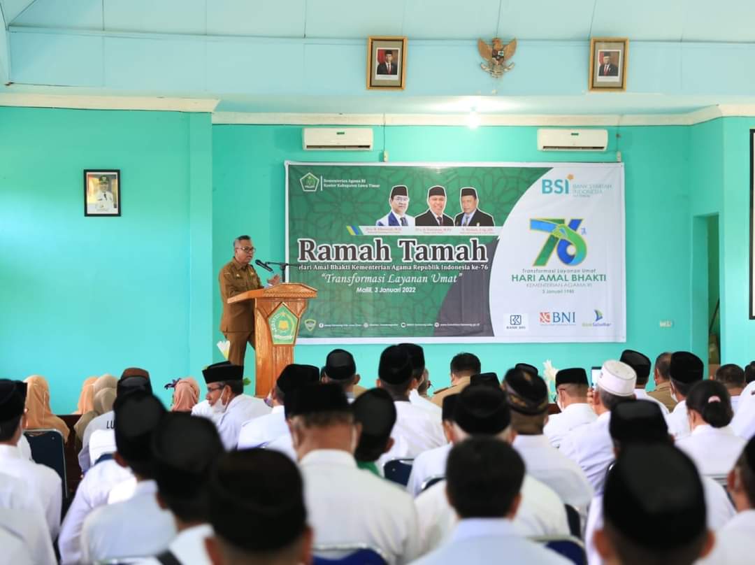 JURNALSULSEL.COM, LUWU TIMUR—Bupati Luwu Timur H Budiman menghadiri Peringatan Hari Amal Bakti (HAB) Kementrian Agama ke- 76, di Bumi Batara Guru bertempat di Gedung Kemenag kabupaten Luwu Timur Senin (3/1/22). Peringatan HAB Ke-76 tahun 2022 mengangkat tema “Transformasi Layanan Umat”.