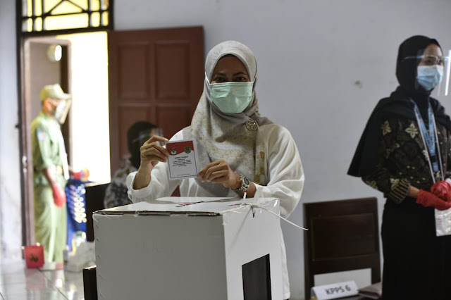 MASAMBA — Calon bupati Luwu Utara, Indah Putri Indriani (IDP) memilih di TPS 003 Dusun Tamboke. Indah didampingi suaminya Muh Fauzi.