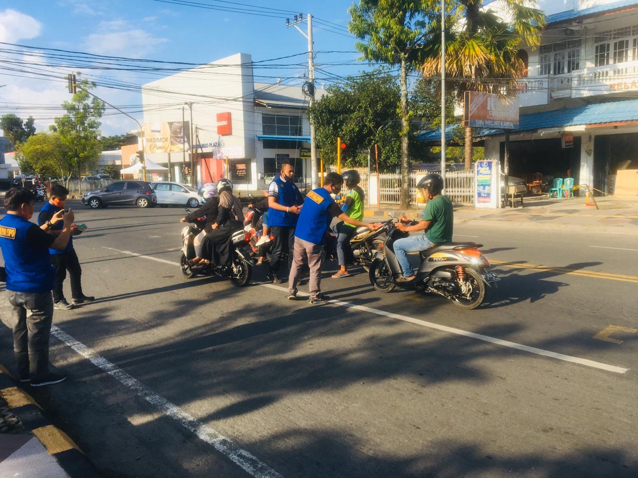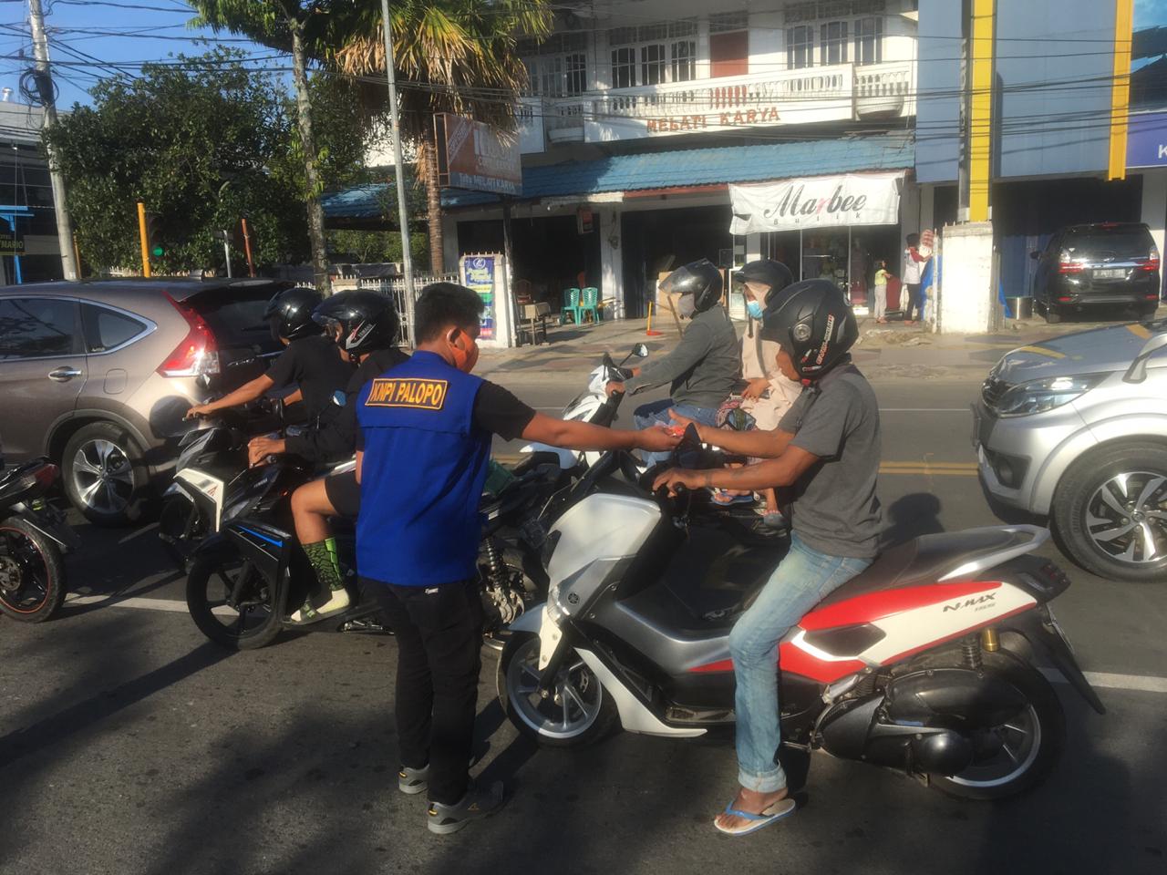 DPD II Komite Nasional Pemuda Indonesia (KNPI) Kota Palopo membagikan masker kepada pengendara dan masyarakat Kota Palopo, Ahad (10/1) sore.