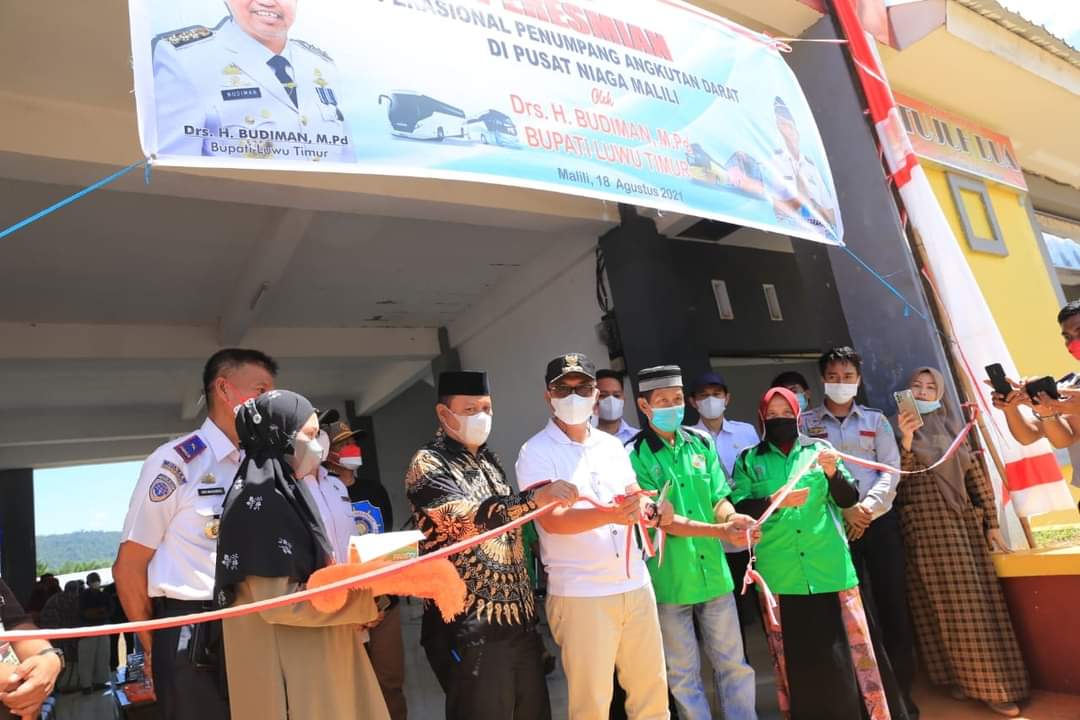 JURNALSULSEL.COM, LUWU TIMUR—Terminal Angkutan Darat Malili resmi pindah di Kawasan Pusat Niaga, Desa Puncak Indah, Kecamatan Malili. Peresmian pengoperasian terminal tersebut ditandai pengguntingan pita oleh Bupati Luwu Timur, H.Budiman yang didampingi Kadis Perhubungan, Andi Makkaraka, Rabu (18/08/2021).