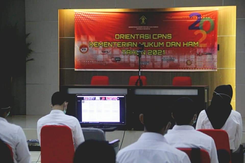 Makassar — CPNS Kantor Wilayah Kementerian Hukum dan HAM Sulawesi Selatan bersama dengan Kantor Imigrasi Makassar, Balai Harta Peninggalan Makassar, dan Balai Pemasyarakatan Makassar ikuti Orientasi CPNS Kemenkumham Tahun 2021 secara virtual di Aula Kanwil (14/01/2021).