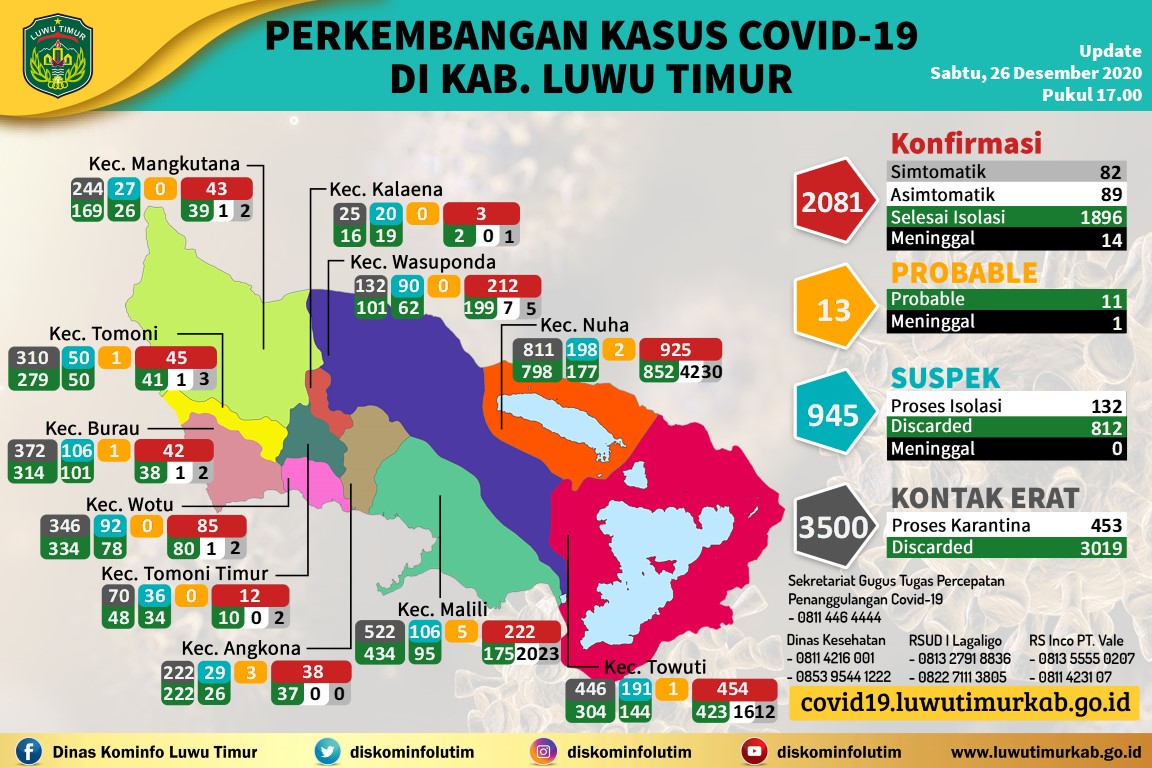 Berikut update lengkap perkembangan virus corona di Kab. Luwu Timur per tanggal 26 Desember 2020 :