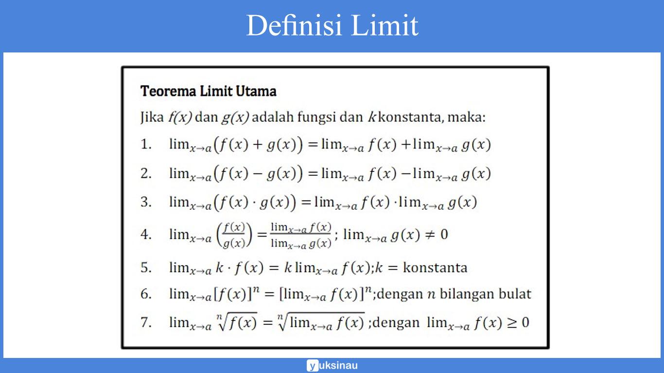 Limit dapat diartikan sebagai menuju suatu batas, sesuatu yang dekat namun tidak dapat dicapai. Dalam bahasa matematika, keadaan ini dapat disebut limit. Mengapa harus ada limit? limit menjelaskan suatu fungsi jika batas tertentu didekati. Mengapa harus didekati? karena suatu fungsi biasanya tidak terdefinisi pada titik-titik tertentu. Walaupun suatu fungsi seringkali tidak terdefinisi untuk titik tertentu, namun masih dapat dicari tahu berapa nilai yang didekati oleh fungsi tersebut apabila titik tertentu semakin didekati yaitu dengan limit.