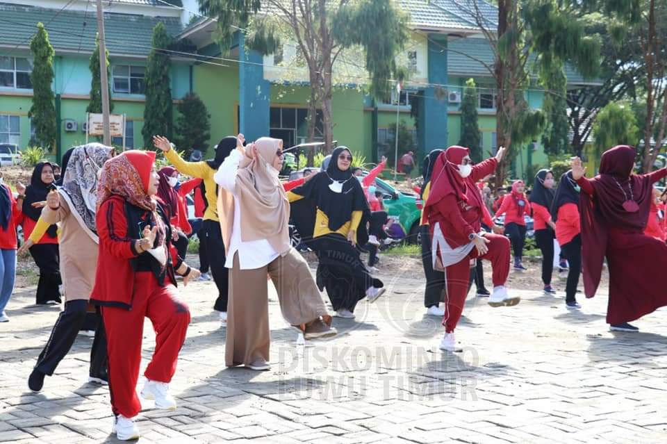 JURNALSULSEL.COM, LUWU TIMUR—Guna mempererat sinergitas dengan Pemerintah Kabupaten Luwu Timur dalam menggalakkan Rabu Sehat, Tim Penggerak PKK, Dharma Wanita Persatuan (DWP) dan Dinas Kesehatan menggelar senam massal di halaman Kantin PKK, Desa Puncak Indah Kecamatan Malili, Rabu (24/11/2021).