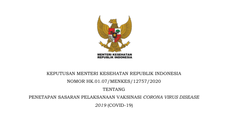 Aturan ini tertuang dalam Keputusan Menteri Kesehatan RI (KMK) Nomor HK.01.07/MENKES/12757/2020 tentang Penetapan Sasaran Pelaksanaan Vaksinasi Corona Virus Disease 2019 (COVID-19), yang ditetapkan oleh Menteri Gunadi Sadikin pada tanggal 28 Desember 2020.
