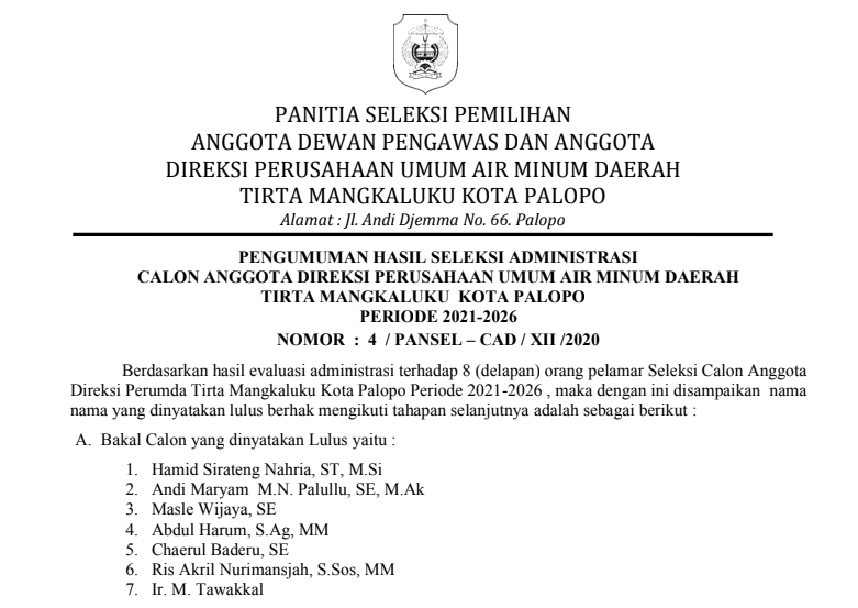 PAOPO — Panitia Seleksi Pemilihan Anggota Dewan Pengawas dan Anggota Direksi Perusahaan Umum Air Minum Daerah Tirta Mangkaluku Kota Palopo,  Mengumumkan Hasil Seleksi Administrasi Calon  Anggota Direksi Perusahaan Umum Air Minum Daerah periode 2021-2026, Melalui Surat Edaran Nomor: 5/PANSEL–CAD/XII/2020.