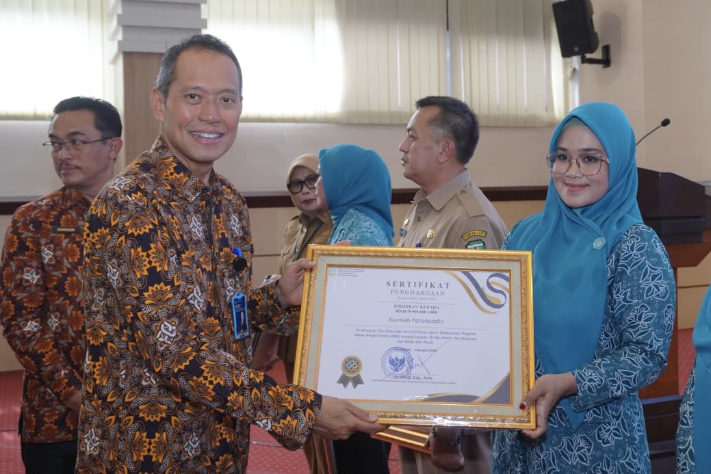 LUWU – Pemerintah Kabupaten Luwu menerima Sertifikat Penghargaan atas dukungan dan komitmen dalam pelaksanaan Program Makan Bergizi Gratis (MBG) bagi sasaran 3B, yakni ibu hamil, ibu menyusui, dan balita non-PAUD. Penghargaan tersebut diberikan oleh Menteri Kependudukan dan Pembangunan Keluarga/Kepala BKKBN, Wihaji, kepada Bupati Luwu Patahudding dan Ketua TP-PKK Kabupaten Luwu Kurniah Patahudding.