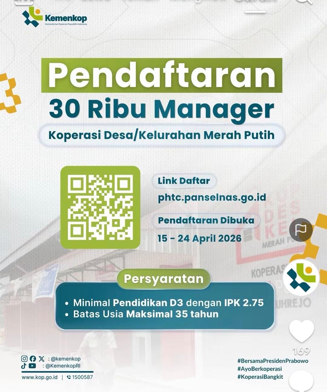 JAKARTA – Pemerintah melalui Kementerian Koperasi dan UKM Republik Indonesia resmi membuka rekrutmen nasional sebanyak 30 ribu manajer untuk Koperasi Desa/Kelurahan Merah Putih (KMP). Program ini menjadi langkah strategis dalam memperkuat peran koperasi sebagai penggerak ekonomi di tingkat desa sekaligus menyiapkan sumber daya manusia yang profesional.