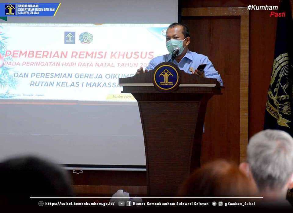 Kepala Kantor Wilayah Kementerian Hukum dan HAM Sulawesi Selatan memberikan Remisi Khusus (RK) Natal Tahun 2021 kepada 13 Warga Binaan pemeluk ajaran kristen dan katholik pada perayaan natal di Rutan Kelas I Makassar, Jumat (25/12/2020).