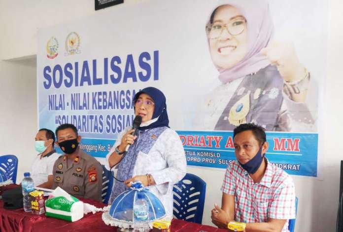 , JURNALSULSEL.COM  — Anggota DPRD Provinsi Sulawesi Selatan, Fadriaty Asmaun kembali sosialisasikan nilai-nilai kebangsaan dengan tema Solidaritas Sosial bertempat di Balai Desa Malenggang Kecamatan Bupon Minggu, 14 Maret 2021.