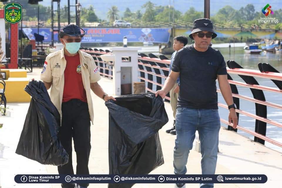JURNALSULSEL.COM, LUWU TIMUR—Bupati Luwu Timur, H. Budiman yang juga selaku Ketua Umum IOF Pengcab Luwu Timur didampingi Ketua Tim Penggerak PKK Luwu Timur, Hj. Sufriyati Budiman memimpin langsung Aksi pungut sampah yang dilakukan di Pujasera, Andi Nyiwi Park, Anjungan Sungai Malili dan Masjid Agung Malili, Jumat (06/05/2022).