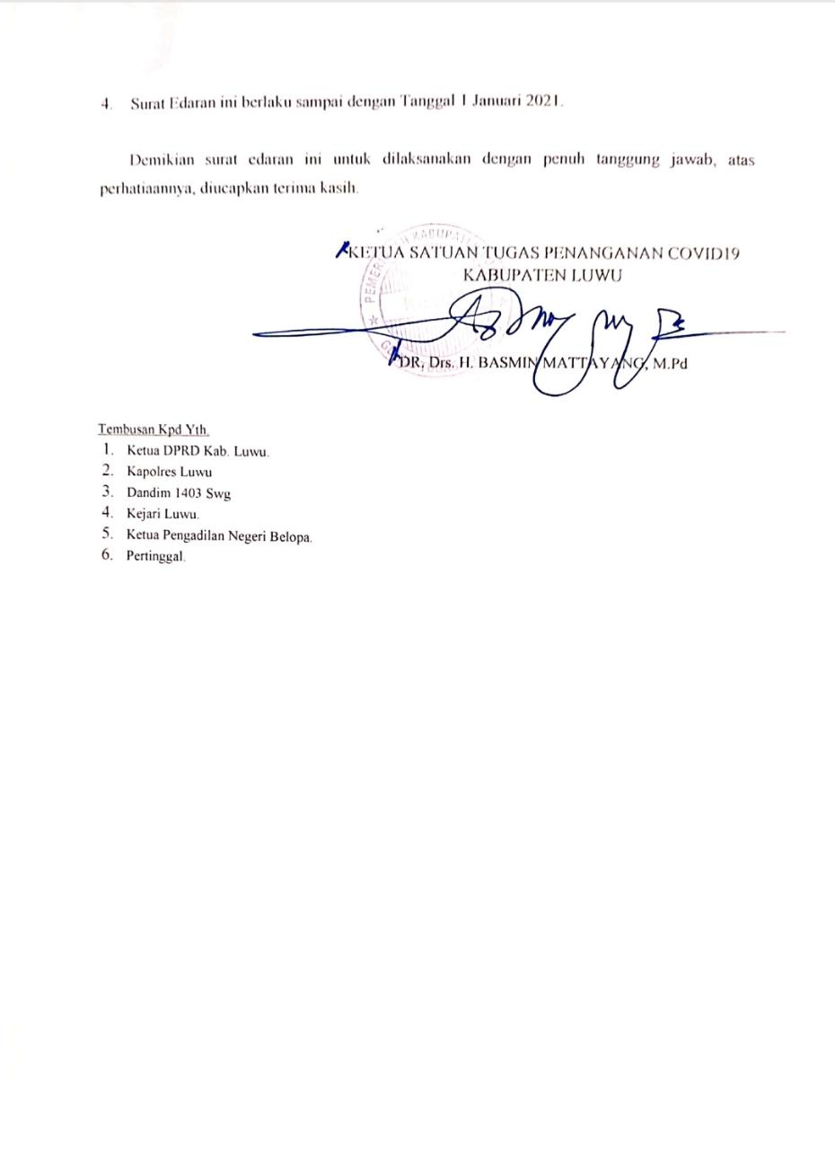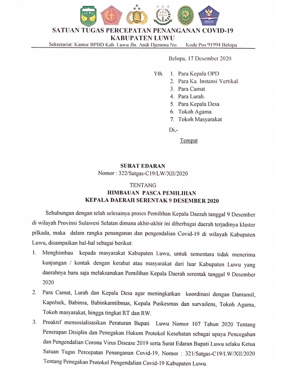 Menghimbau Kepada seluruh masyarakat Kabupaten Luwu untuk sementara tidak menerima kunjungan ataupun kerabat  dari luar Kabupaten Luwu,yang telah melaksanakan Pilkada serentak 9 Desember 2020 dan khusus bagi Pegawai PNS dan non PNS Untuk tidak berkunjung ke Daerah yang baru saja laksanakan Pilkada Serentak Saat Libur Natal dan Tahun Baru ini.
