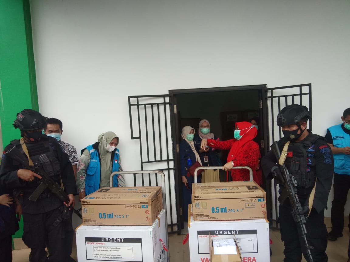 PALOPO – Vaksin Covid-19 jenis Sinocav tiba di UPT Puskemas Wara, Jl. Anggrek Non Blok, Kota Palopo dengan pengawalan ketat Brimob Kompi 3 Batalyon B Pelopor.